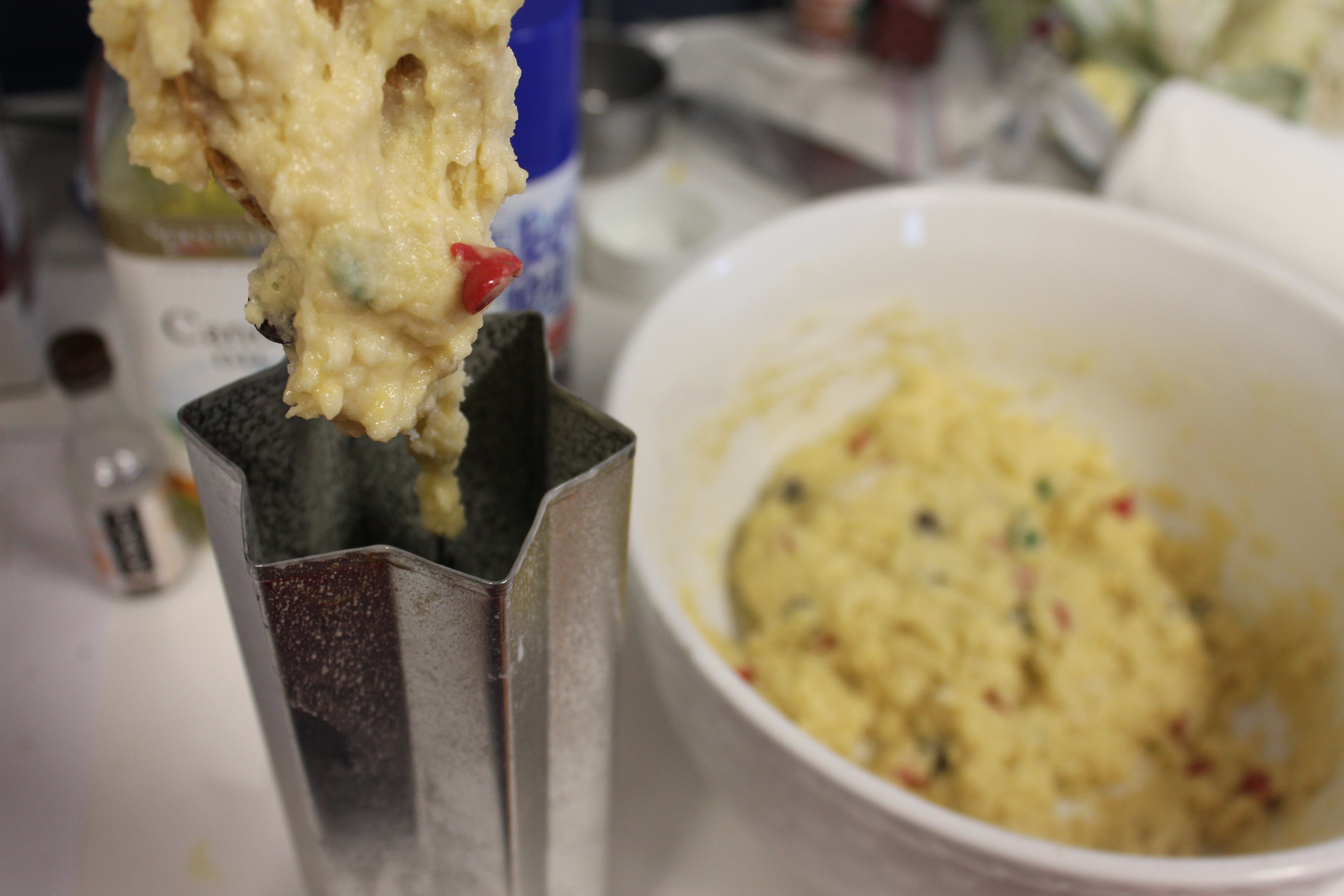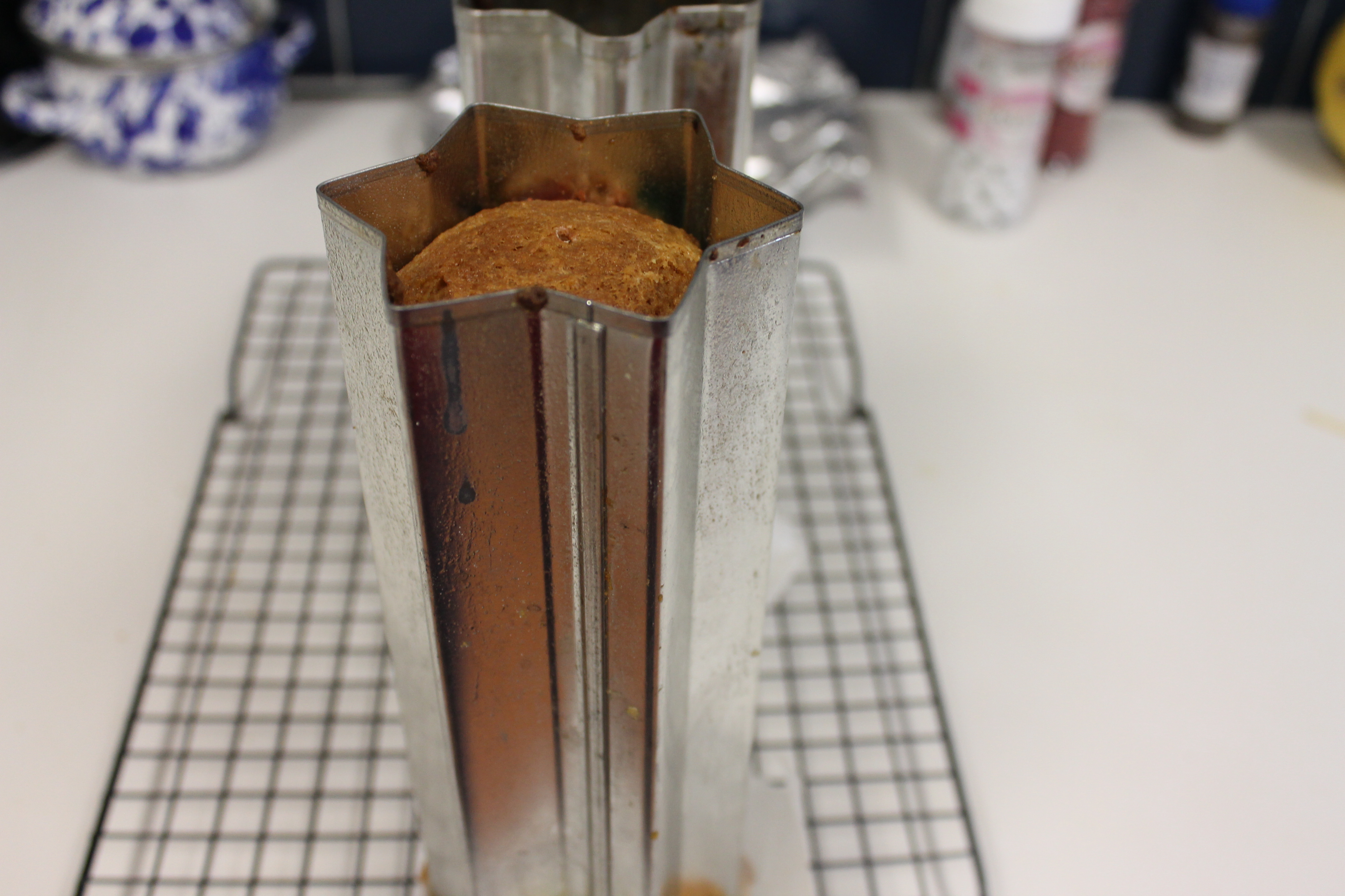 For this recipe I used two vertical star pans (also known as canapé bread tubes) which were about half filled. Whatever you do, don’t fill the pan more than half full! If you only have one pan, the remaining batter can be baked in cupcake tins. If you don’t own one of these fun pans, this bread can also be baked in a loaf pan for about an hour.