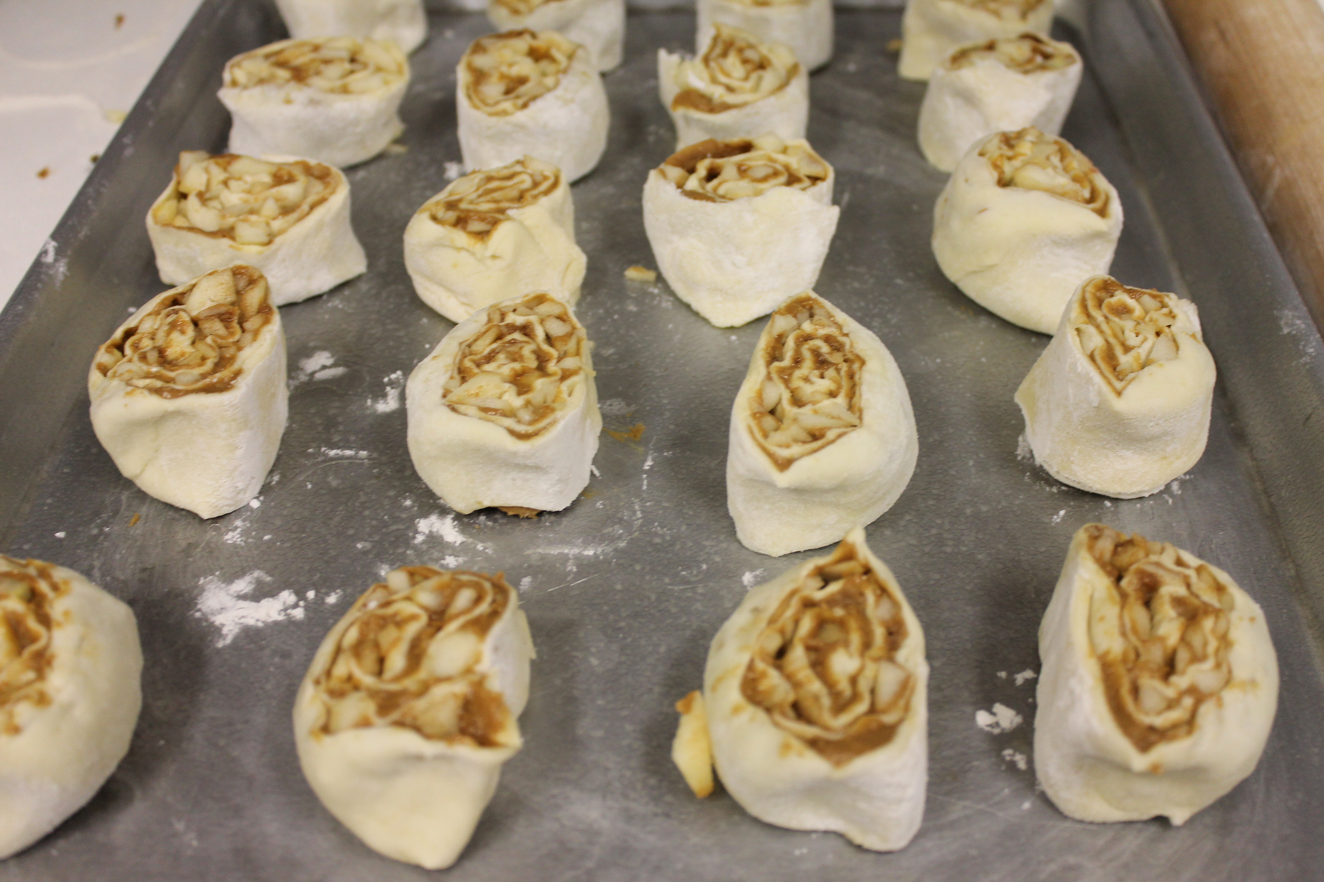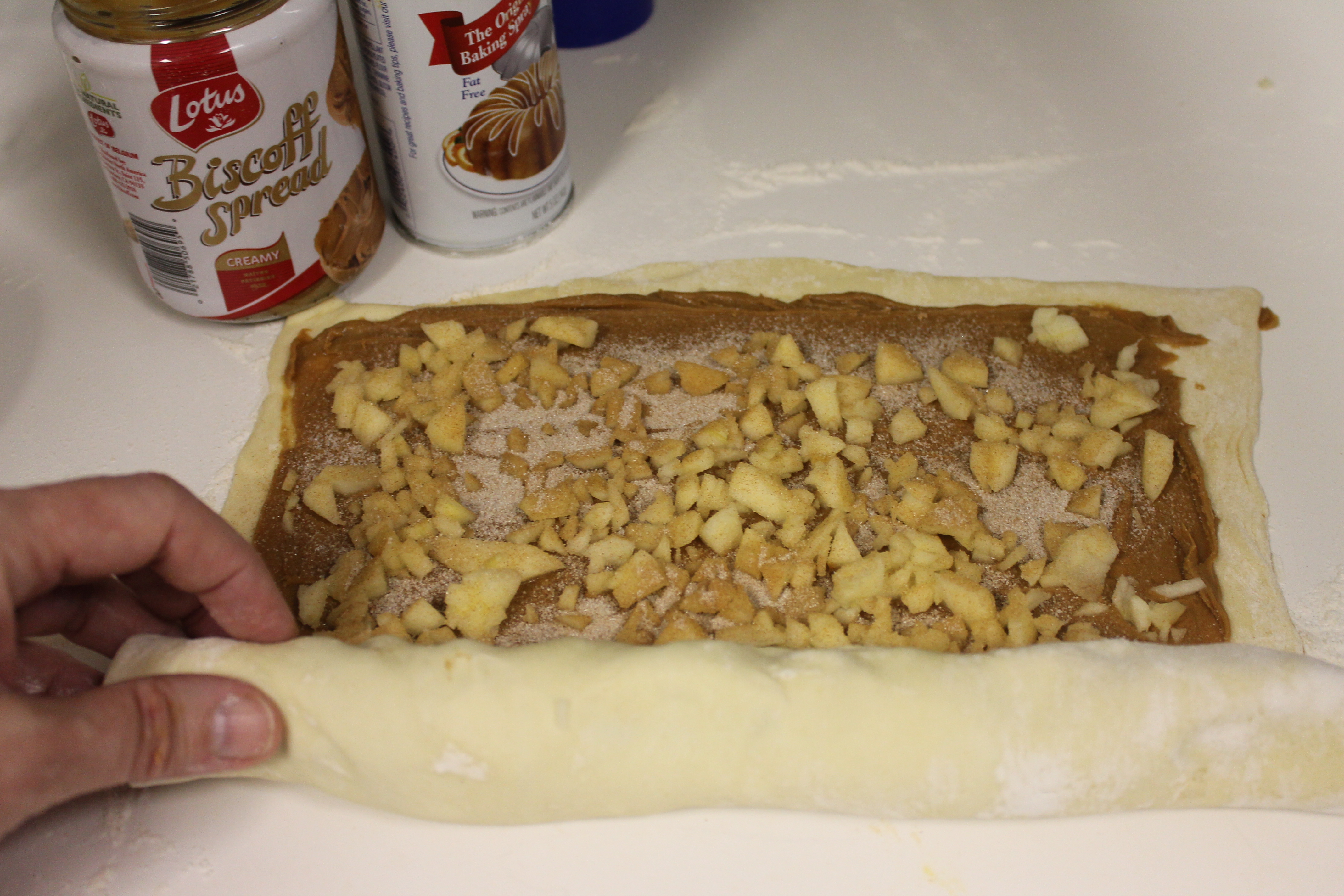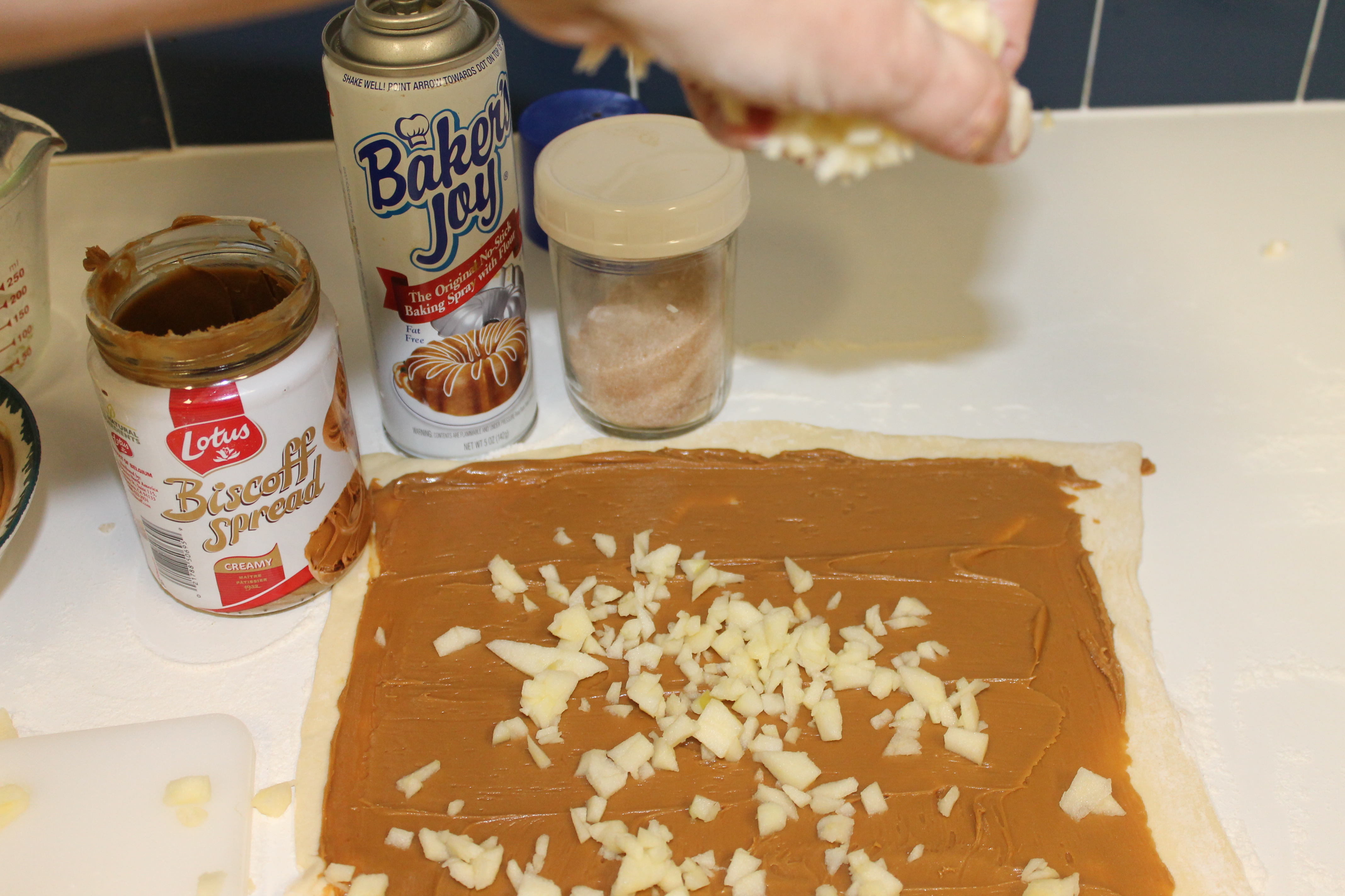 Sprinkling diced apples over the Biscoff covered pastry.