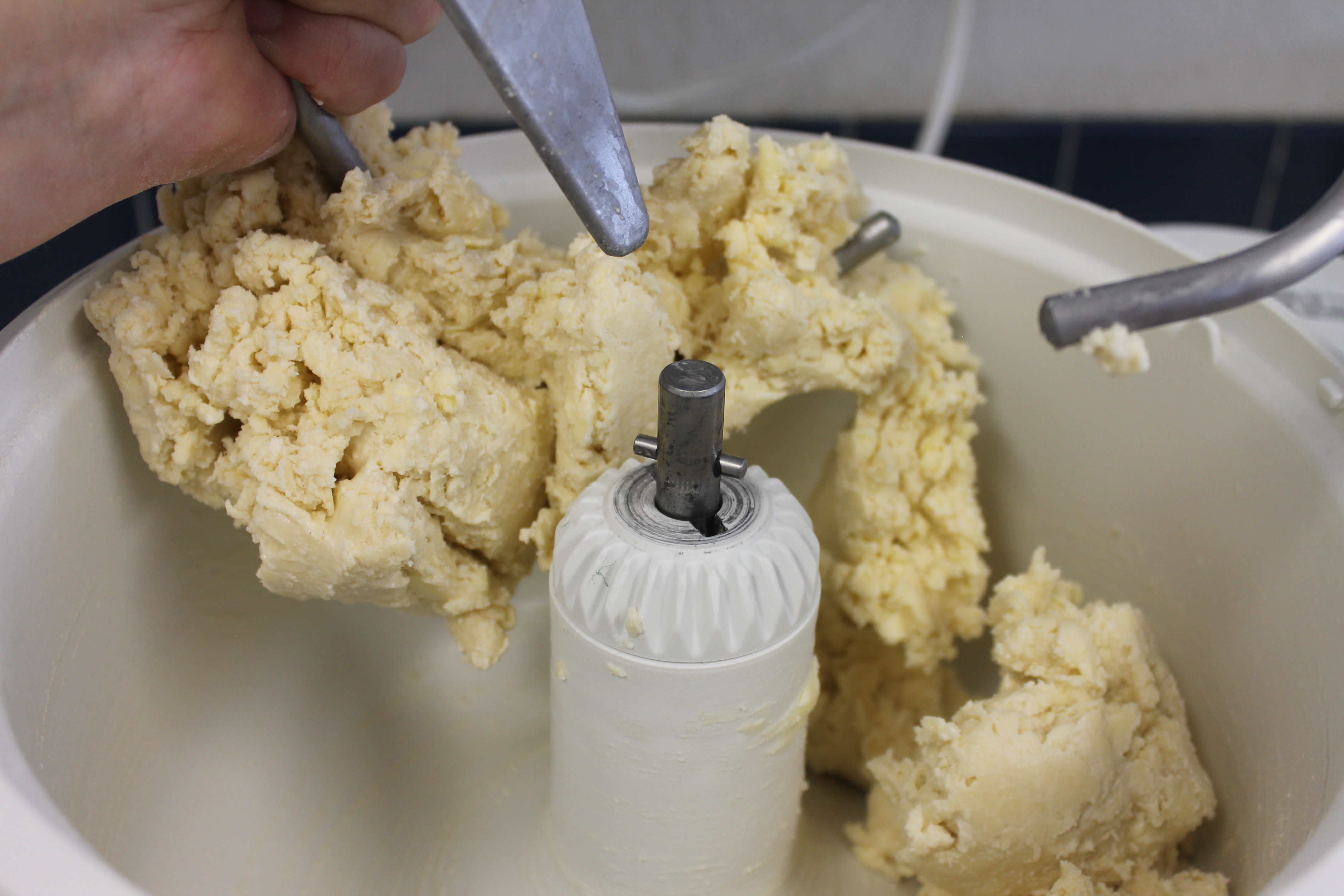 - Mix the lukewarm milk mixture into the yeast mixture. Add eggs one at a time, mixing well.