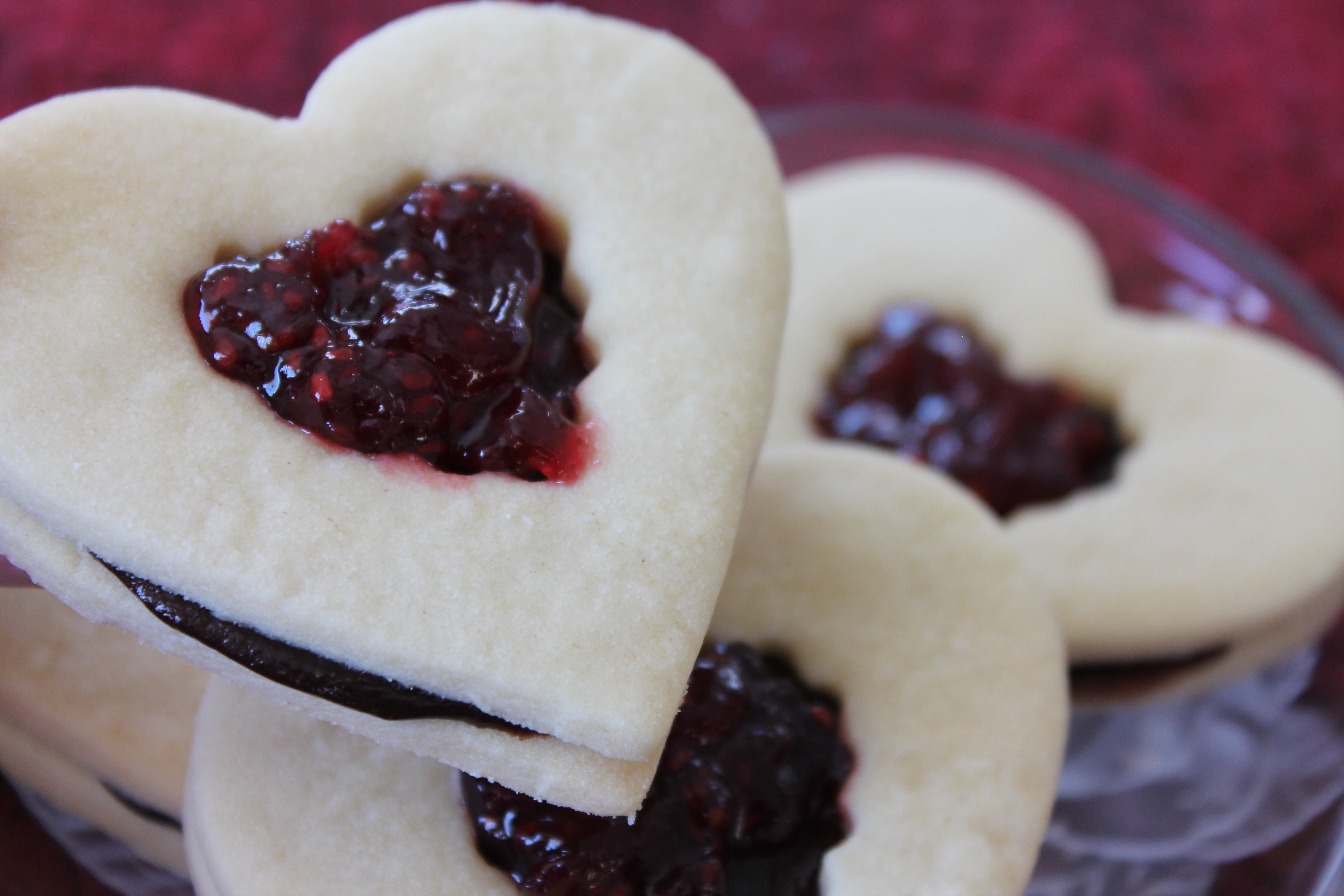 With Valentine’s Day right around the corner, heart shaped everything has been dancing in my head. You’re in for it now! To start the insanity, here is a recipe for heart shaped shortbread cookies with a dark chocolate ganache filling and a dollop of raspberry jam.