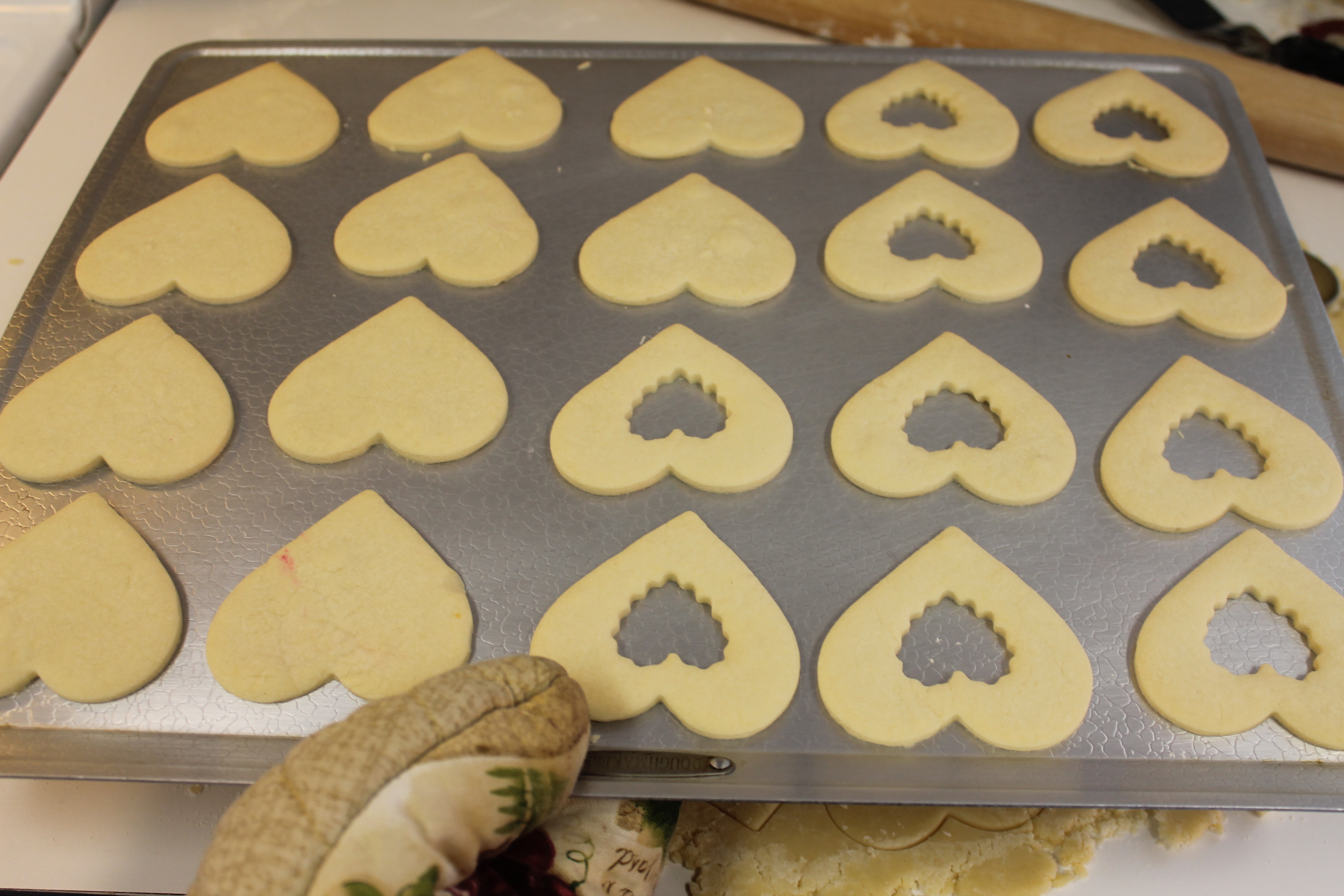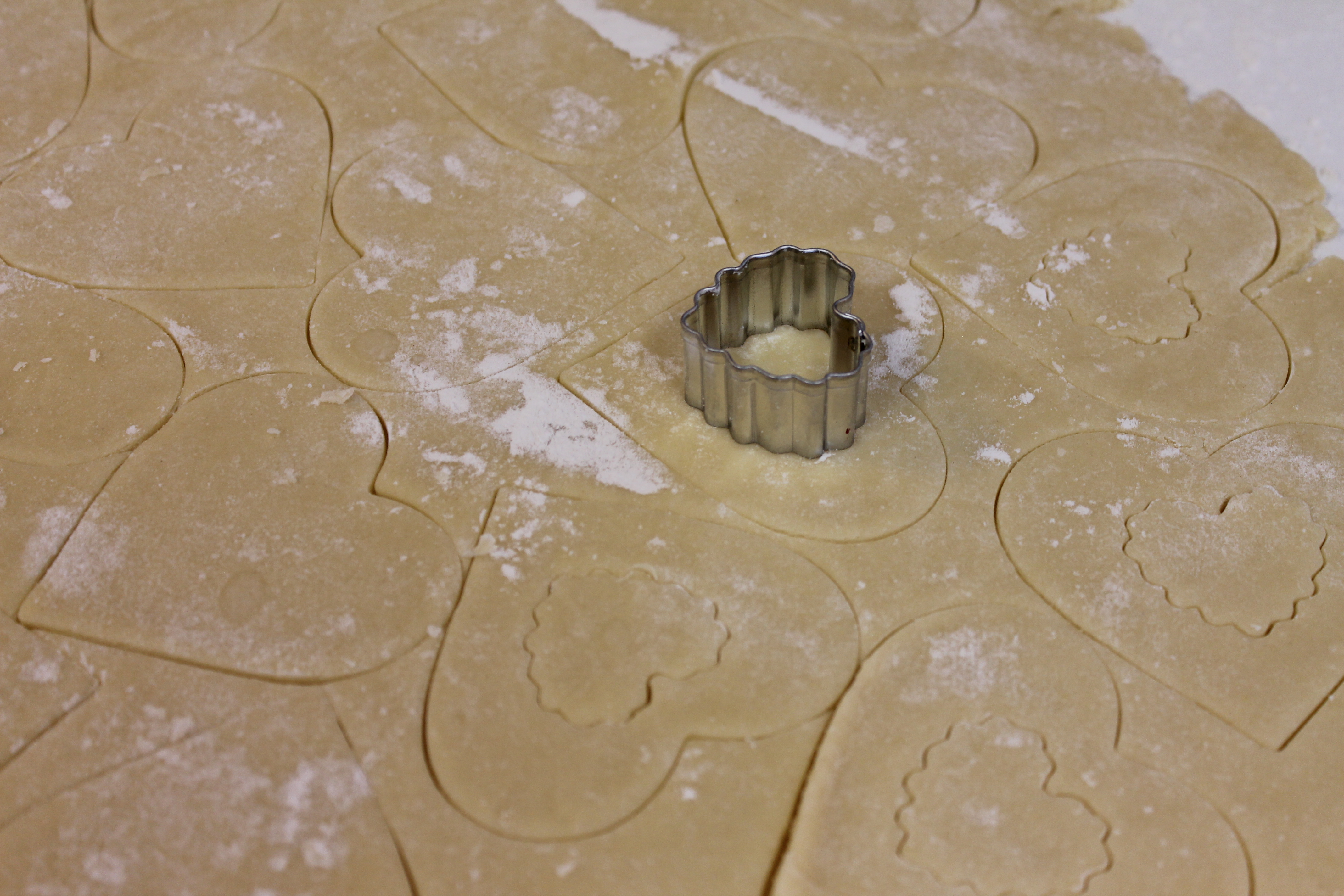 - On a floured surface, working with half of the dough at a time, roll thinly (picture a thick pie crust.) Cut with a large heart-shaped cookie cutter. Using a small cutter, cut out a hole in the center of half of the cookies.