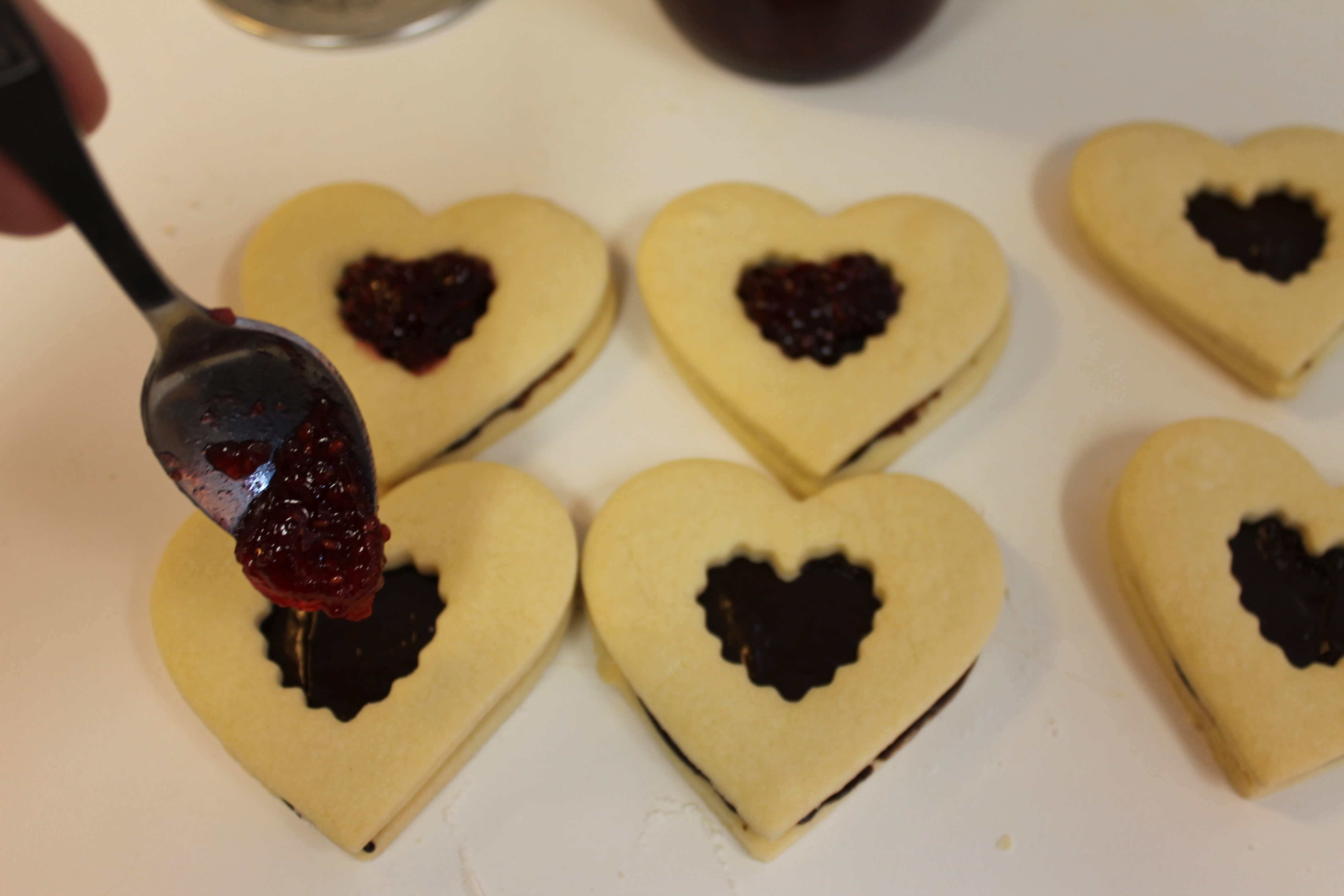 - Spread a thin layer of ganache on the solid cookies, then gently set a top (with the hole) cookie over the ganache. Drop a small amount of jam into each hole, being careful not to get it on the cookie.