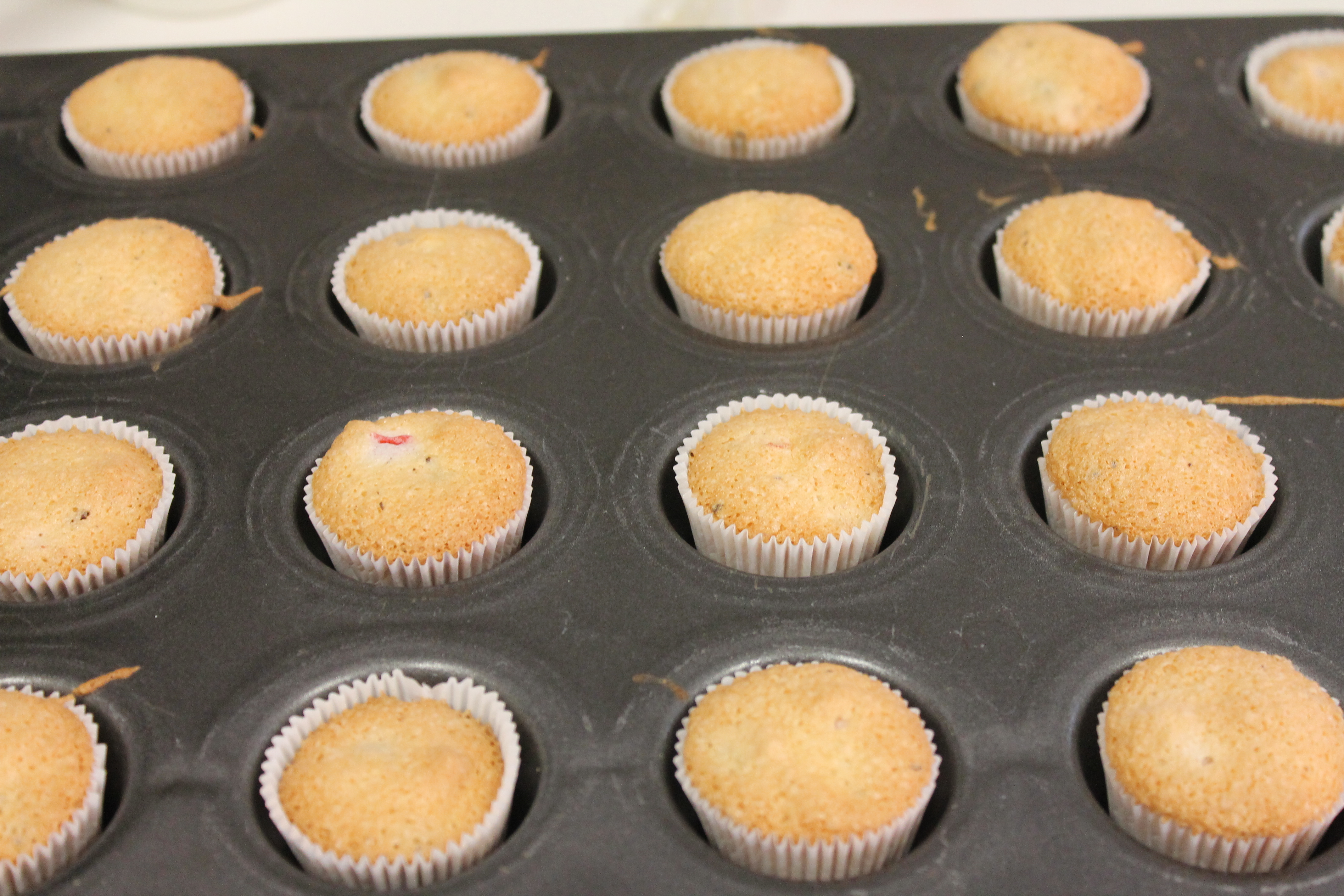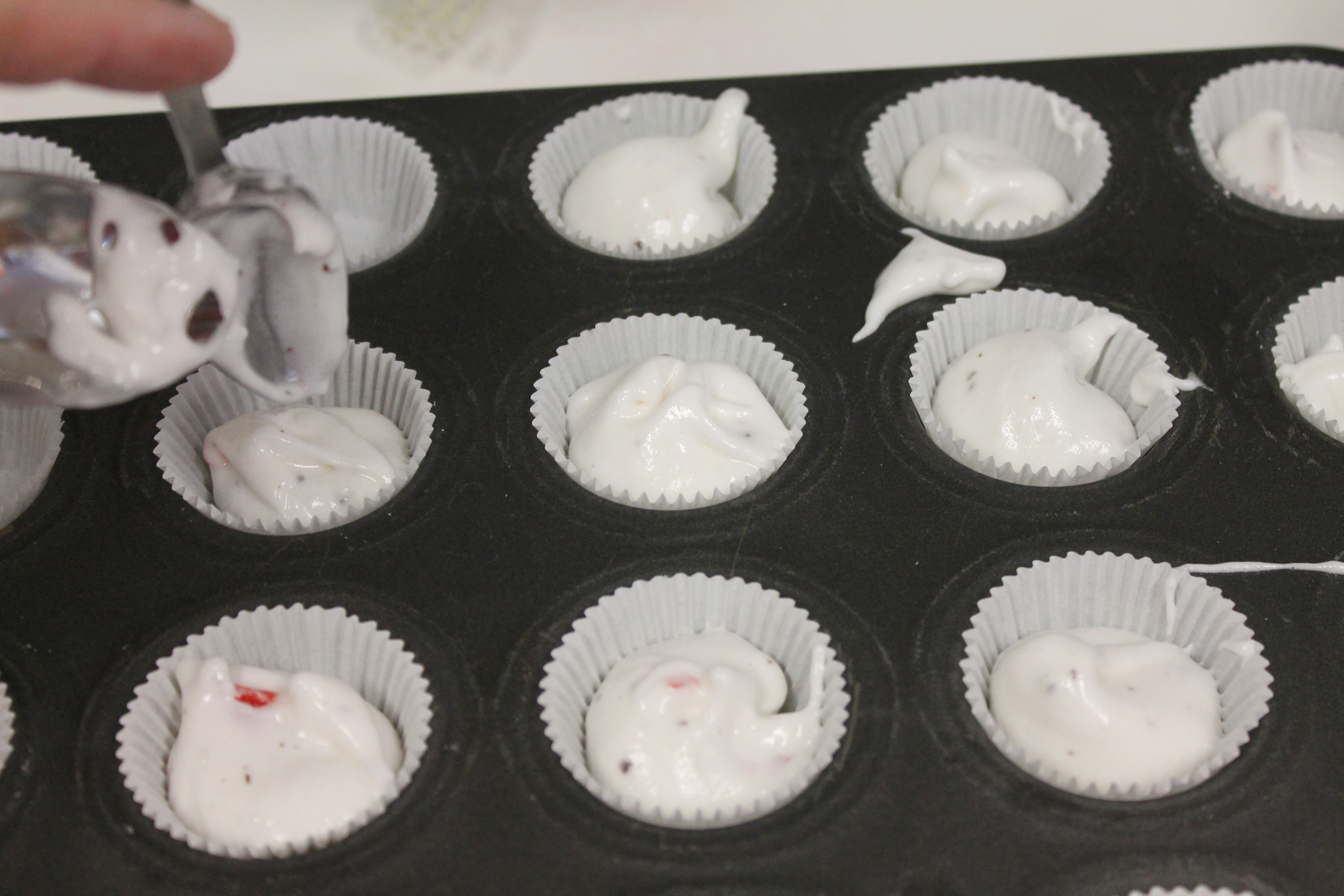 - Spoon into cupcake liners, ⅔ full.