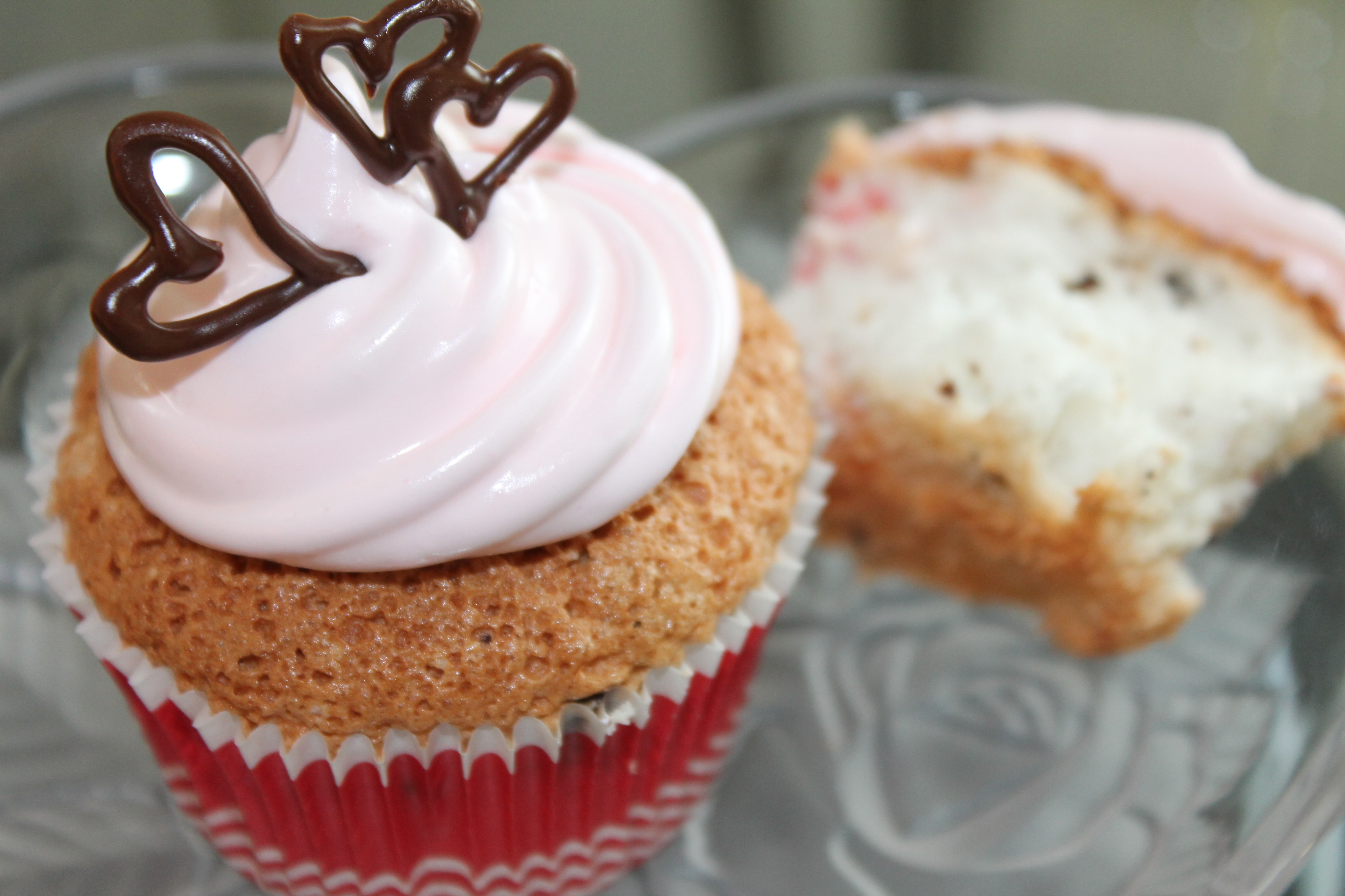 I piped melted chocolate onto waxed paper, making little heart shapes for decorating. You could also use sprinkles or Valentine’s candy. If you’re making the larger cupcakes, a chocolate covered cherry on the top would be lovely!